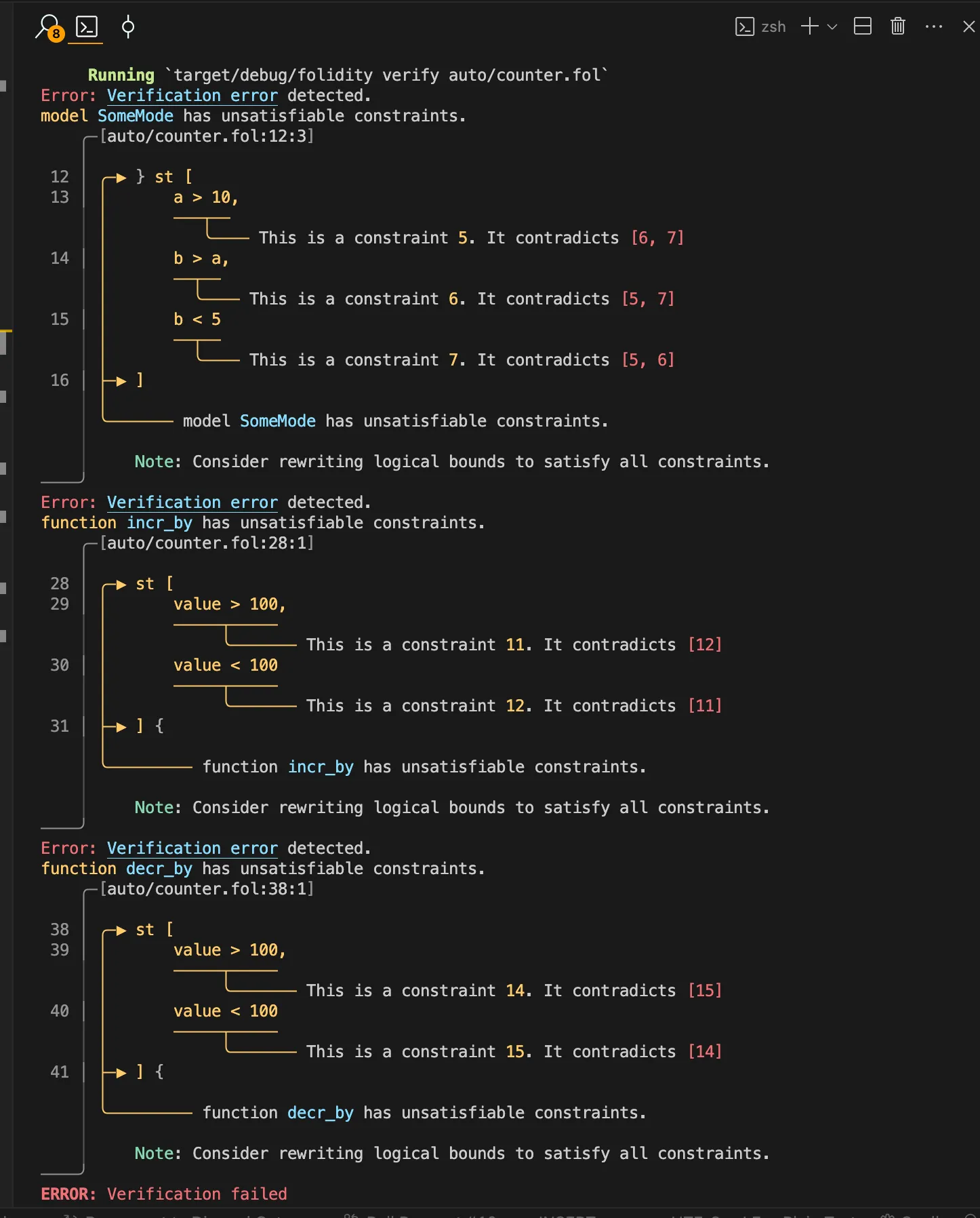 Folidity’s grammar is structured with first-class support for formal verification in mind. Therefore, the compiler can imply and prove certain mathematical and functional properties of the program directly from the code without the need to perform any context translations, as in the aforementioned solutions.