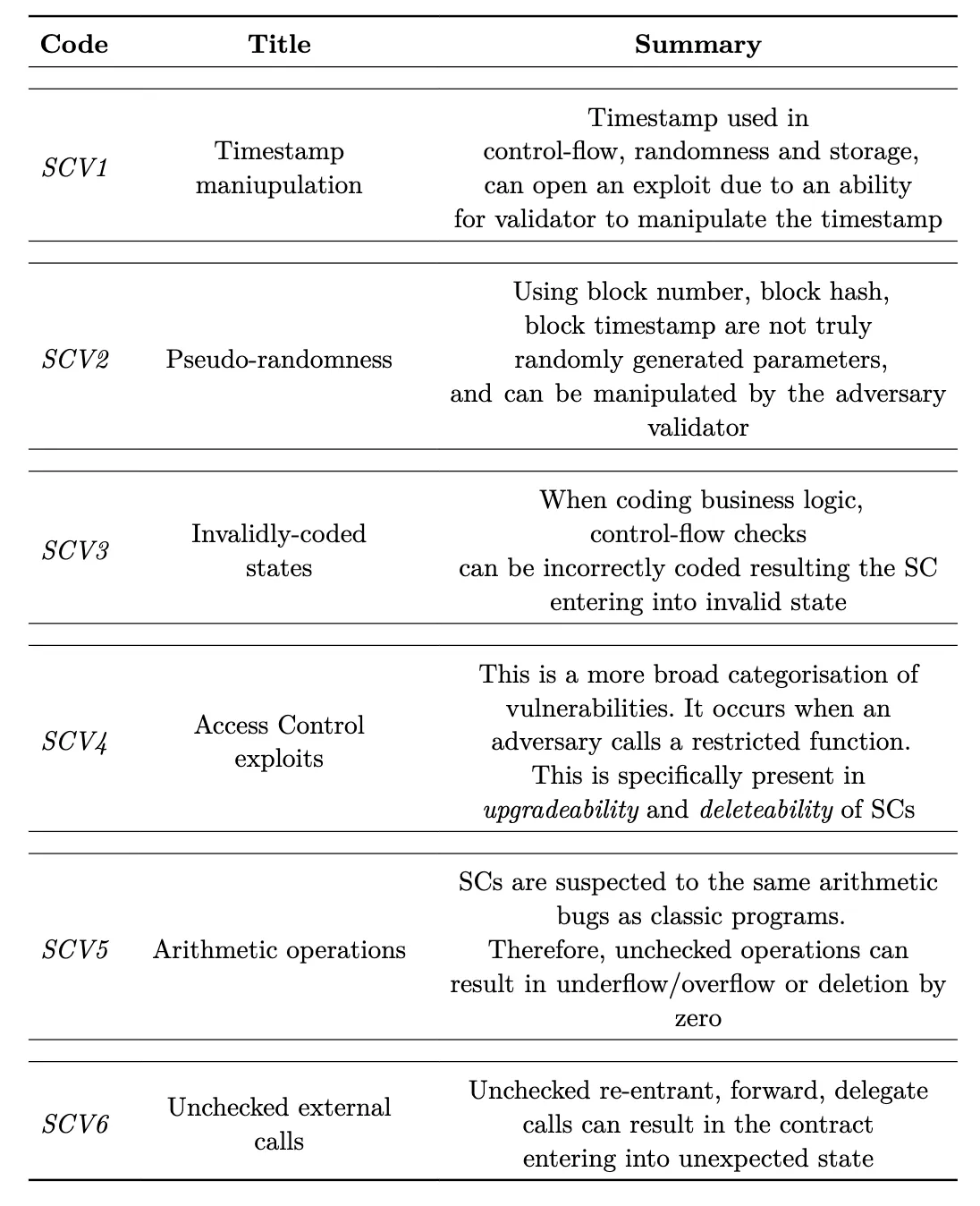 There has been an effort in both academia and industry to classify common vulnerabilities and exploits in SCs in blockchain systems 7 8. Some of the work has been recycled by bug bounty platforms, growing the community of auditors and encouraging peer-review of SCs through the websites such as Code4rena, Solodit, and many others.